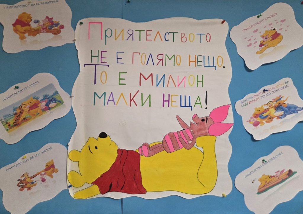 За първи път в детската градина се организирана изложба на тема „Приятелството е сила“. Децата изработиха красиви и цветни рисунки, чрез които показаха какво означава за тях приятелството – усмивки, игри заедно и подадена ръка към другия.